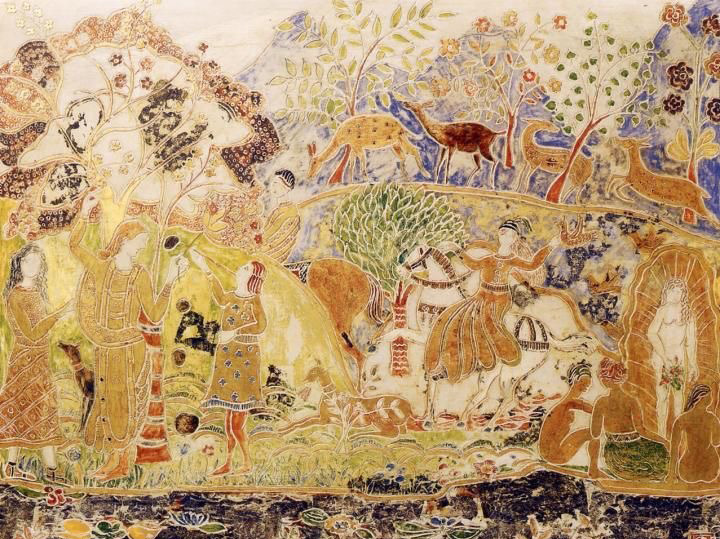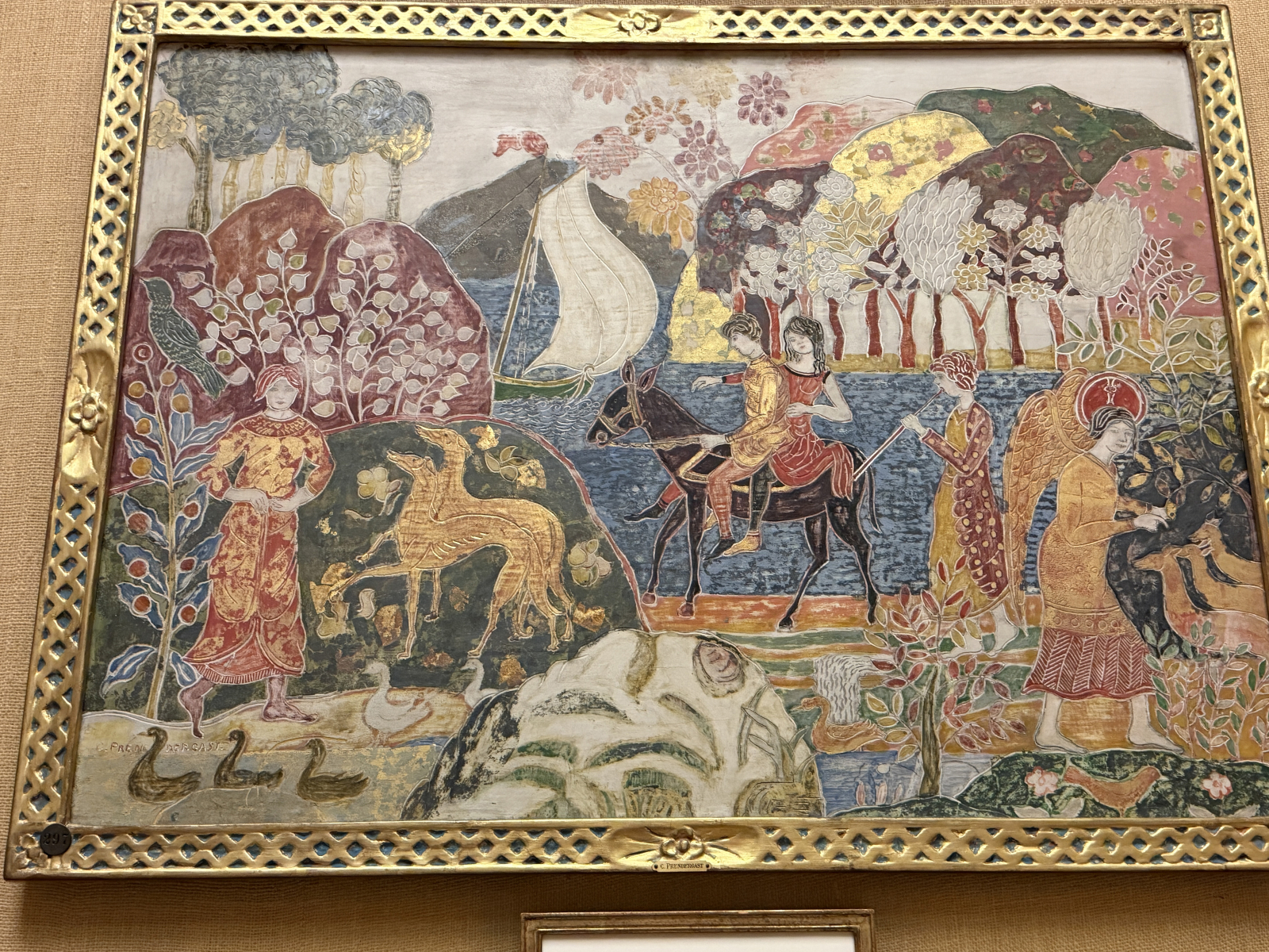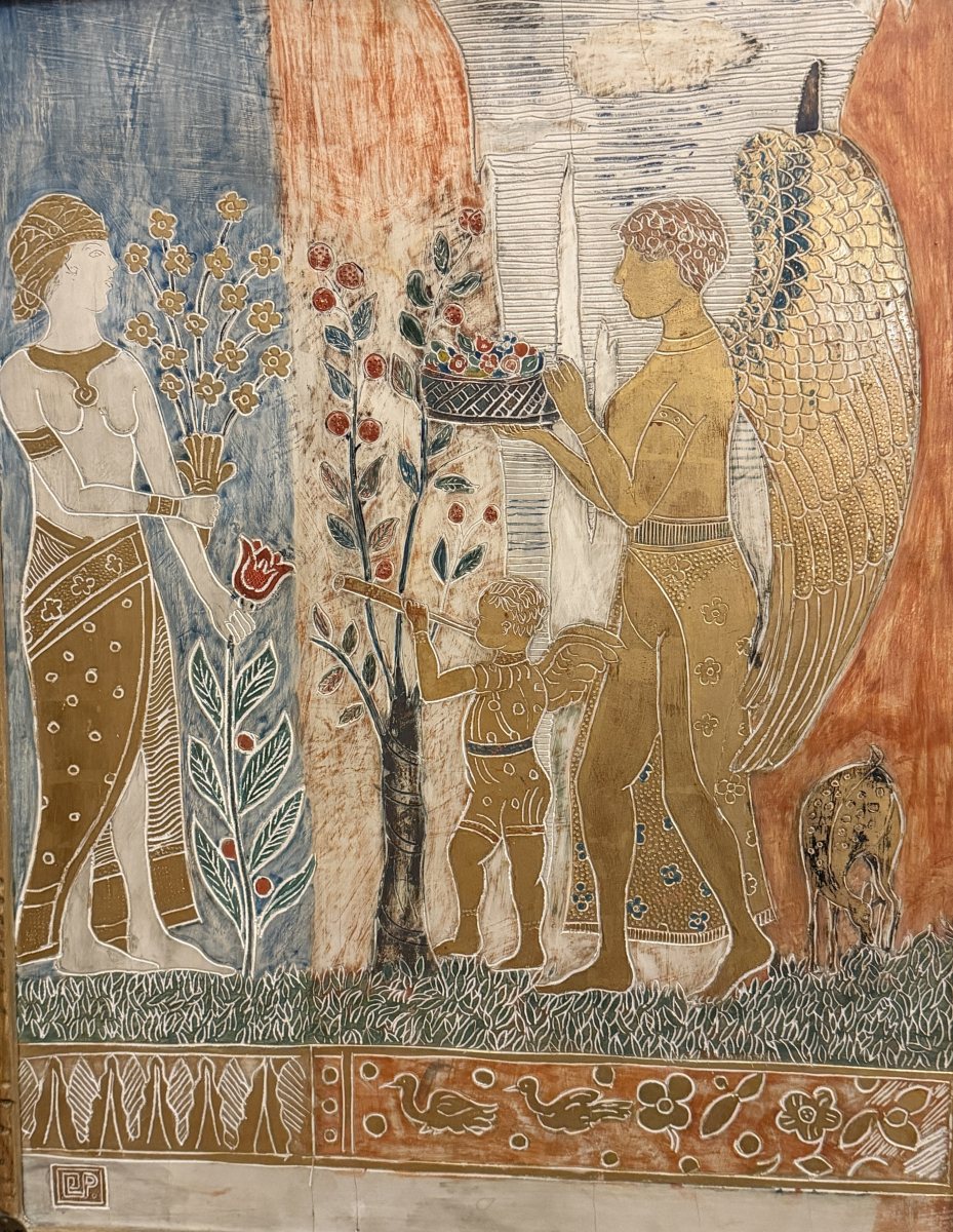 Charles translated this love of pattern into his own medium; he filled his carved tempura panels with dense floral motifs, repeated figures, and sinuous lines, all glowing against gold leaf backgrounds. In both cases, the goal was not photographic realism, but a heightened, decorative world where color and design create their own kind of truth.