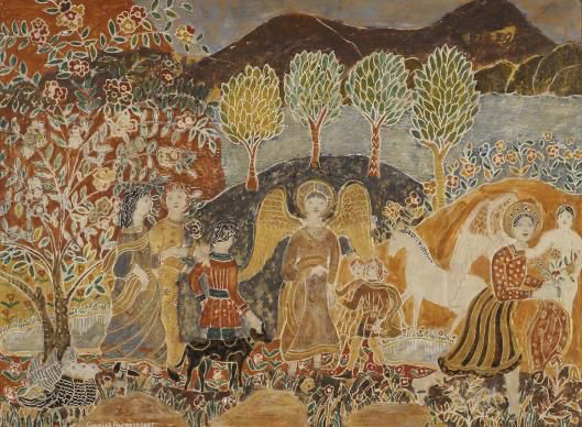 He painted these gessoed panels with tempura and oil, using bright, flat colors and simplified outlines. His style is deliberately “naive” or “primitive,” with flattened perspective, exaggerated forms, and a rhythmic, patterned composition.