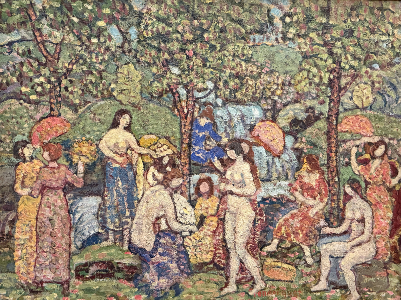 I recently went to the Barnes Foundation in Philadelphia for the 2nd time. I blogged about the foundation a couple months ago. Such a unique place to look at work. It’s a bit overwhelming at first, but then your eyes and mind adjust and the brilliance of the displays takes over. There was one painter in particular that caught my eye, Charles Prendergast. Of all the marvelous paintings hanging in this one room, my eye went to his painting.
