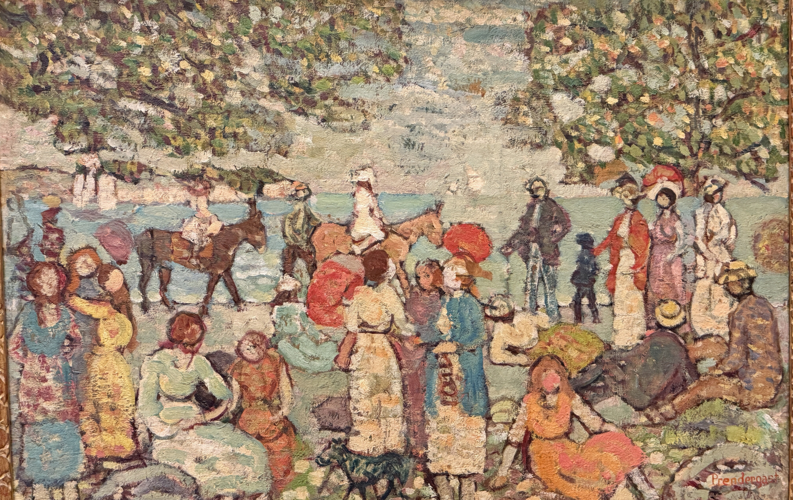 Prendergast’s technique was shaped by his deep study of historical sources, including medieval reliefs, Italian sacred panels, and Persian and Chinese miniatures . He borrowed motifs like angels, Madonnas, and courtly scenes, but simplified and stylized them into dreamlike fantasy scenes.