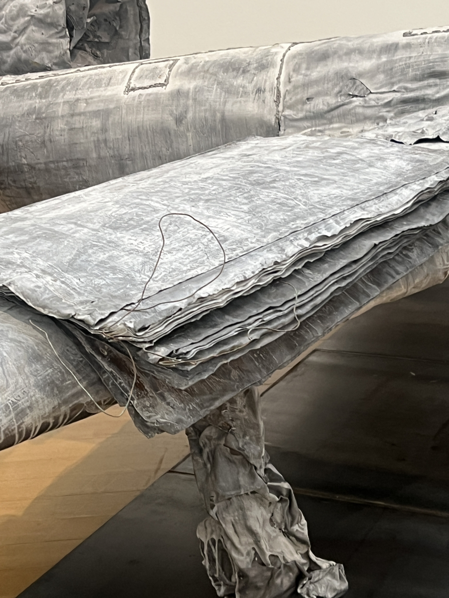 Kiefer’s use of molten lead is both physical and metaphorical. He values lead’s mutability, symbolism in alchemy, and its ability to transform a surface through destruction and elevation. The actions-pouring, peeling, burning and tearing are chosen for their visual results and also for their resonance with philosophies relating to transformation, spirituality and history.