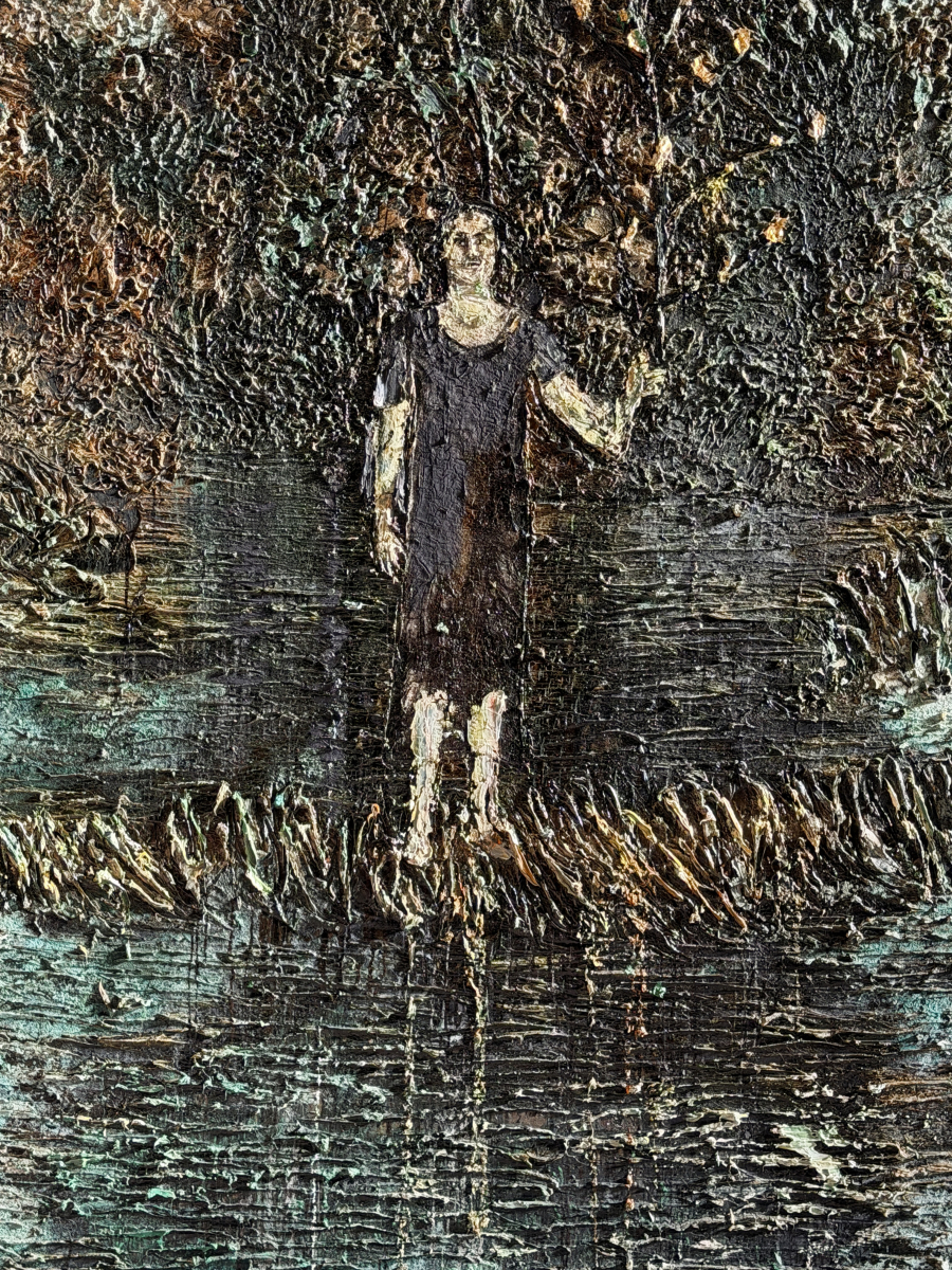 And his works are massive, powerful, and he is prolific. At 80, he demonstrates no signs of slowing down. For example, a piece of his work might be 30 feet tall and 60 feet long, and it might include paint, straw, wood, metal, and other materials he has put into the surface, sometimes burned and partially destroyed. It's too simplistic to say that it is a canvas he's painted on. Sometimes he will treat the canvas or medium with chemicals or electrolysis. And he has designed a way to generate and create a new type of verde green patina.