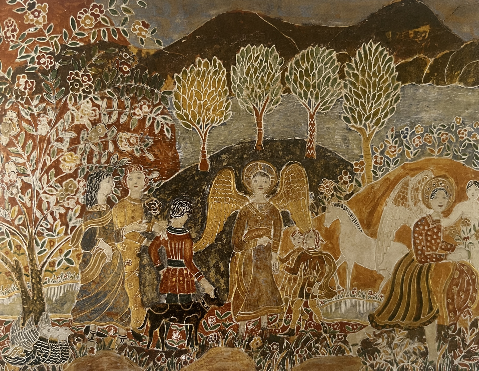 What I love about this is the technique of part carving, part painting. It is a called Japanning, a western imitation of oriental lacquer work in which figures were modeled in low relief in gesso, with metal (silver or gold leaf ) applied on a black or red painted background. On the surface the outline of his cartoon is transferred with charcoal, and the deeper lines are incised with gouges and chisels. Over this is spread several coats of gesso plaster, and while it is still wet, the more delicate lines are traced with a fine steel point. Over such figures and details to be gilded is spread a second coat of special plaster. And when all this has been thoroughly dried and all the roughness removed by sandpaper and pumice stone, it is ready for the application of gold or silver leaf and color. I love the whimsical nature and the patchwork of patterns. It’s delightful! I never heard of this artist before or this interesting technique. His brother’s work, Maurice has a whimsical appeal as well but is traditional painting.